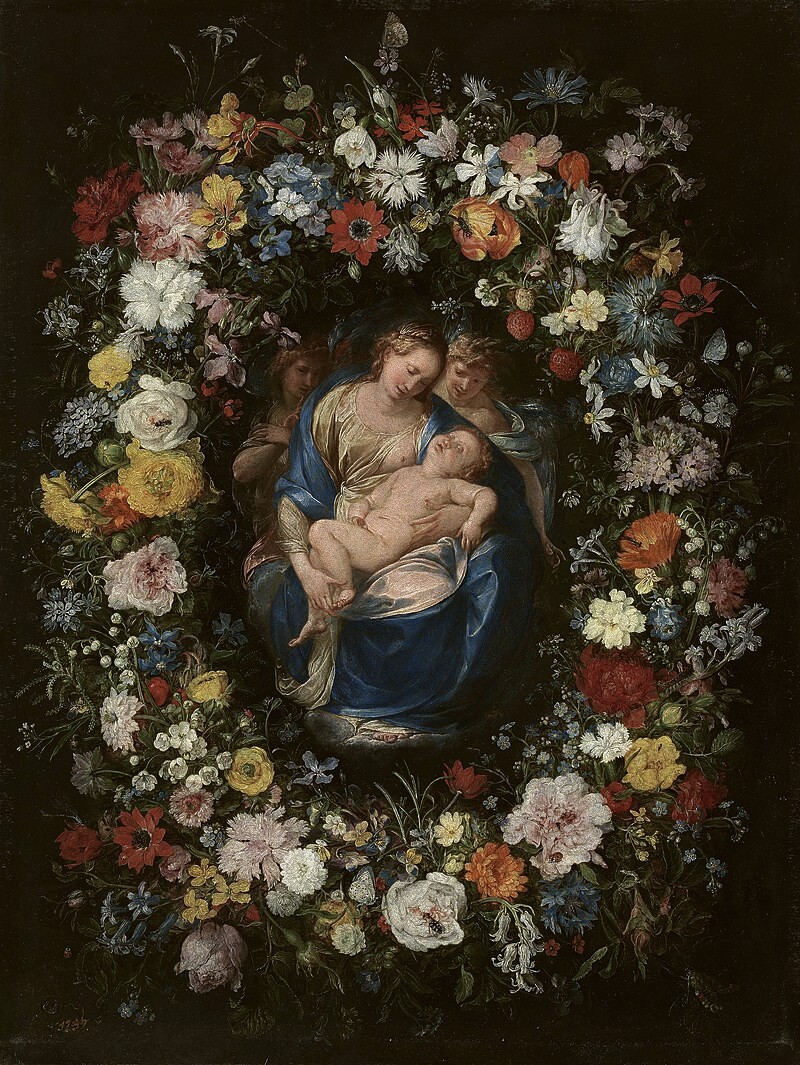 Madonna und Kind mit zwei Engeln in einem Blumenkranz Jan Brueghel d. Ä. 1619 Öl auf Kupfer 48×36cm Prado Madrid Grabschrifft eines Fischers