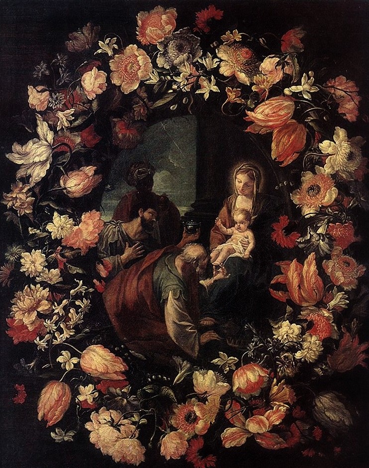 Anbetung der Könige in einer Blumengirlande von Mario Nuzzi & Carlo Maratta 1654 Öl auf Leinwand 75 × 61 cm Eremitage Sankt Petersburg, Wikipedia: Mario Nuzzi & Carlo Maratta
