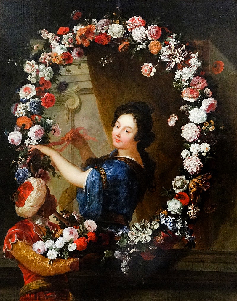 Marie-Madeleine de La Vieuville (1693-1755), Comtesse de Parabère, beim Knüpfen einer Blumengirlande von Jean-Baptiste Belin de Fontenay & Antoine Coypel 1690 Öl auf Leinwand Musée des Beaux-Arts Caen, Wikipedia: Jean-Baptiste Belin de Fontenay & Antoine Coypel