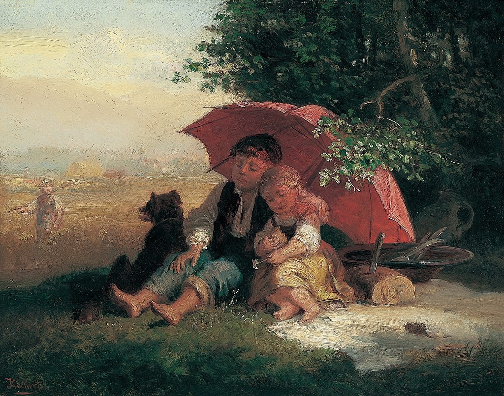 Kinder unterm Schirm von Julius Köckert Öl auf Holz
