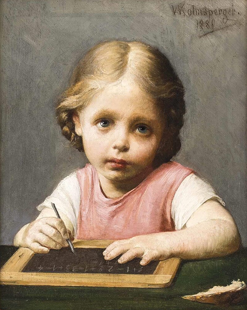 Tochter Wetti bei einer Rechenhausaufgabe von Waldemar Kolmsperger der Ältere Öl auf Leinwand Wikipedia: Waldemar Kolmsperger der Ältere