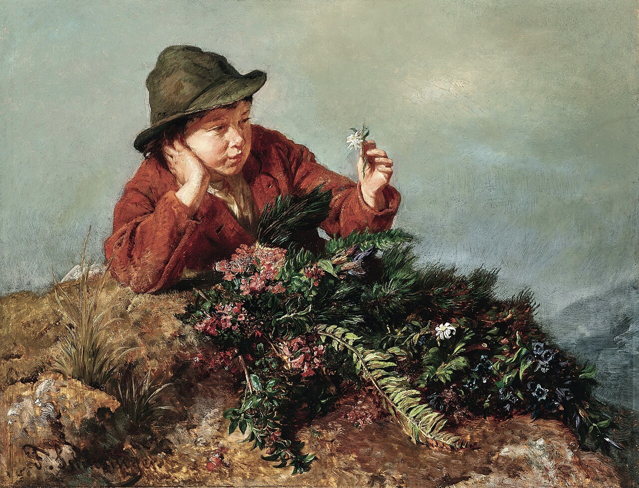 Junge mit Edelweiß von Felix Schlesinger 1861 Öl auf Holz 39 x 50 cm