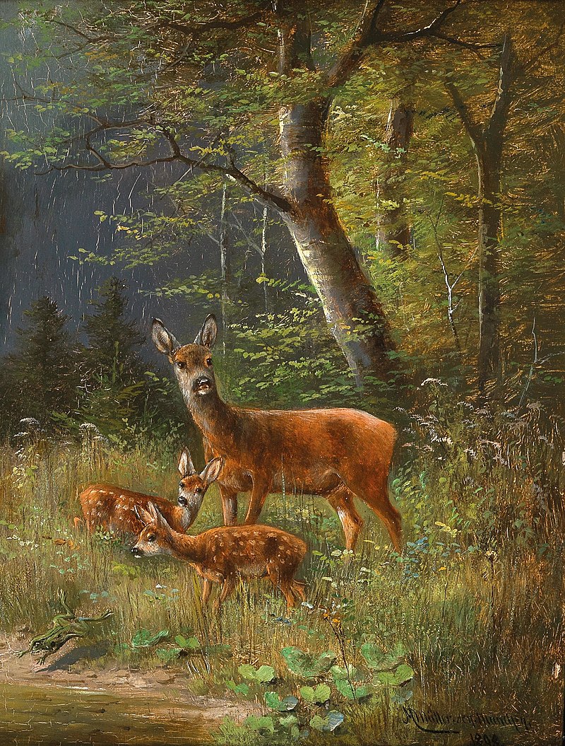 Rotwildfamilie auf einer Waldlichtung von Moritz Müller 1898 Öl auf Leinwand 26x20,5cm