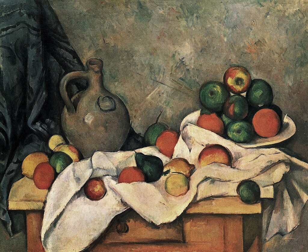 Stillleben mit Vorhang, Krug und Obstschale von Paul Cézanne 1893–1894 Öl auf Leinwand Privatbesitz USA, Wikipedia: Paul Cézanne