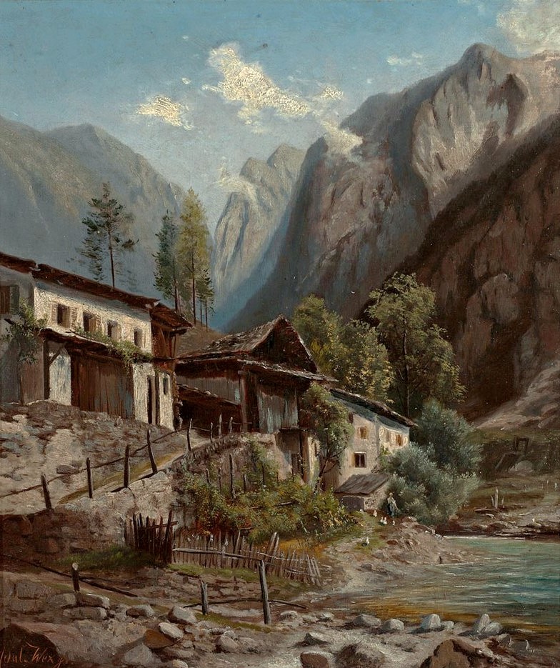 Gebirgslandschaft mit Gehöften an einem Bach von Adalbert Wex Öl auf Leinwand