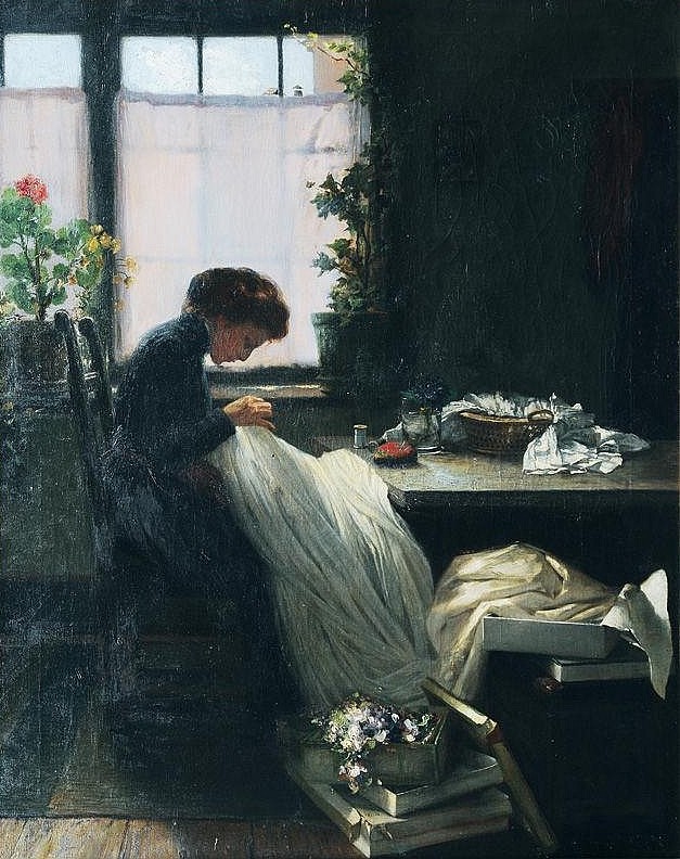 Nähende Frau von Hans August Zierngibl Öl auf Leinwand