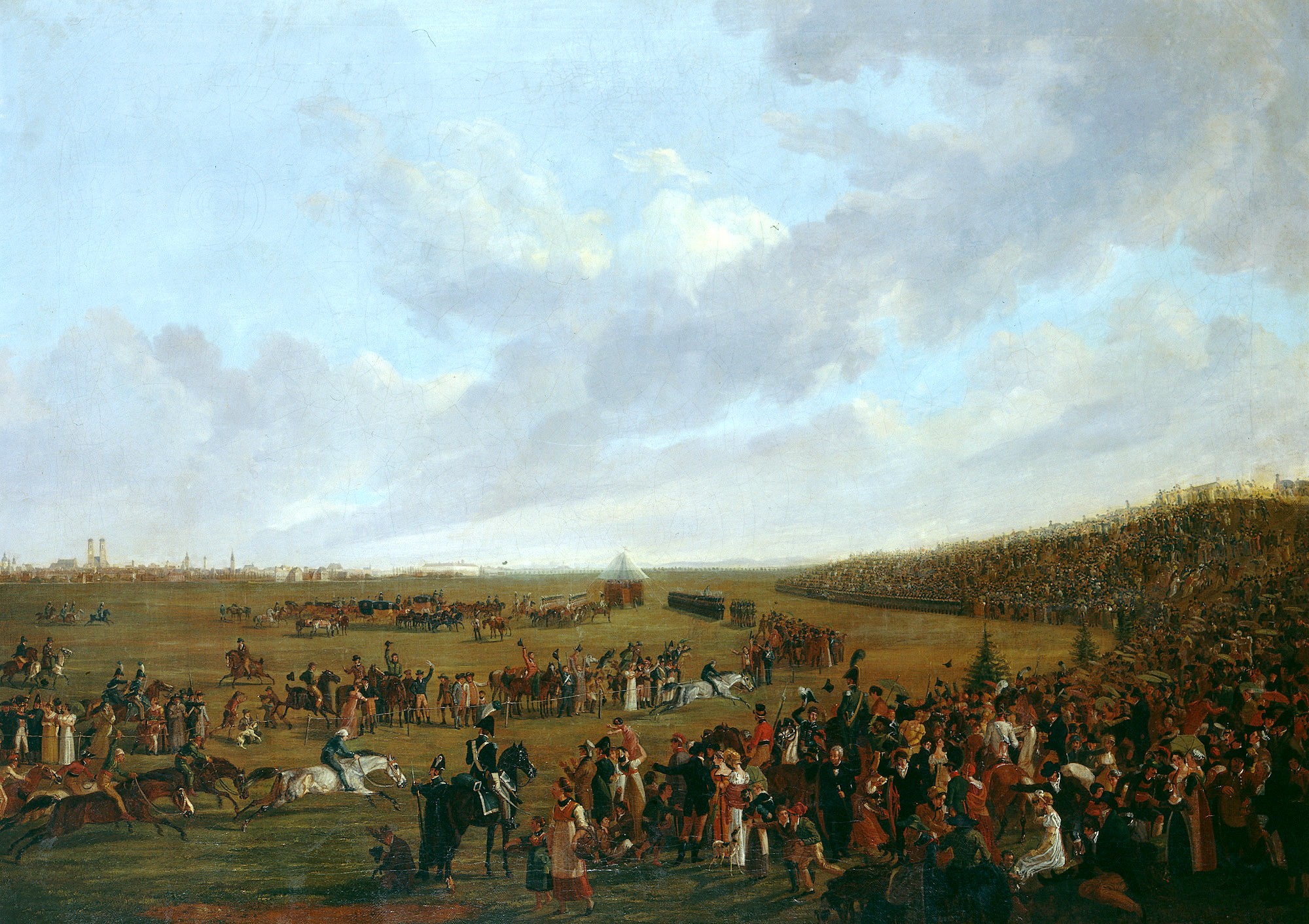 Das Pferderennen auf dem Münchner Oktoberfest 1810 von Peter Hess 1810 Öl auf Leinwand 72cm x 101cm Stadtmuseum München, Wikipedia: Peter Hess