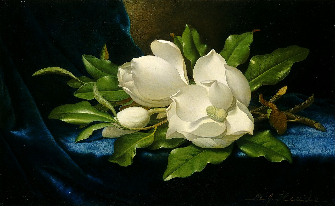 Giant Magnolias on a Blue Velvet Cloth von Martin Johnson Heade 1890 Öl auf Leinwand 38,4×61,5cm National Gallery of Art Washington, D.C., Wikipedia: Martin Johnson Heade