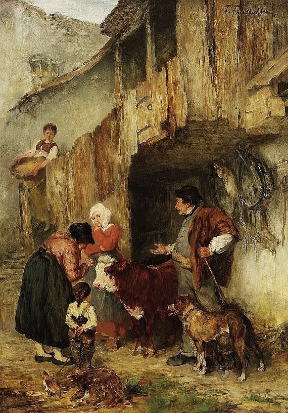 Bergdorf mit Bauern von Franz Friedbichler Öl auf Leinwand